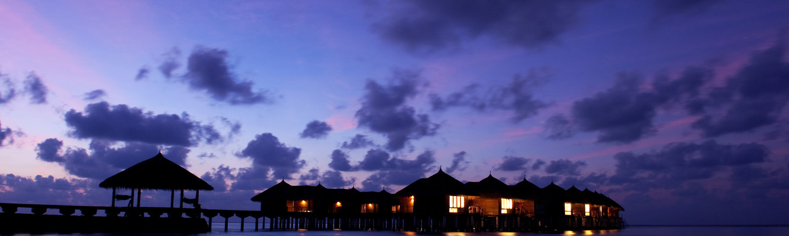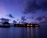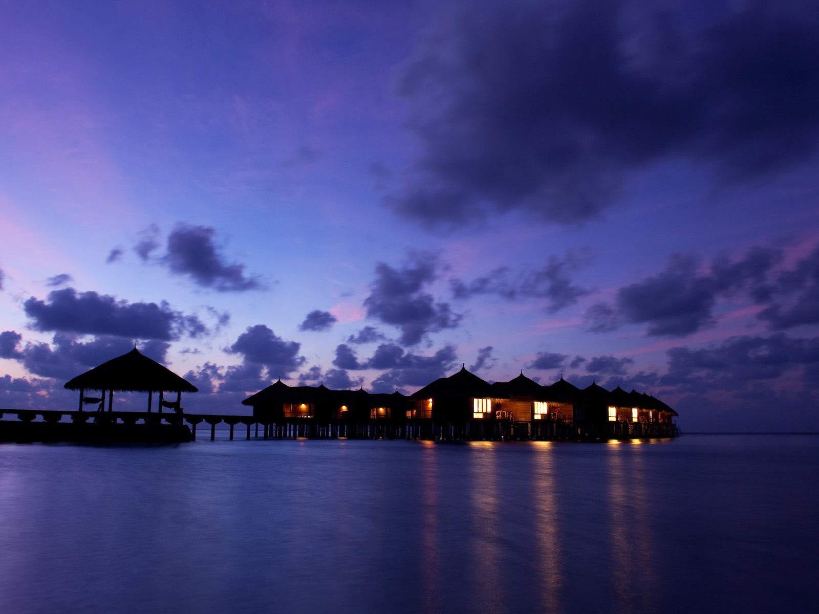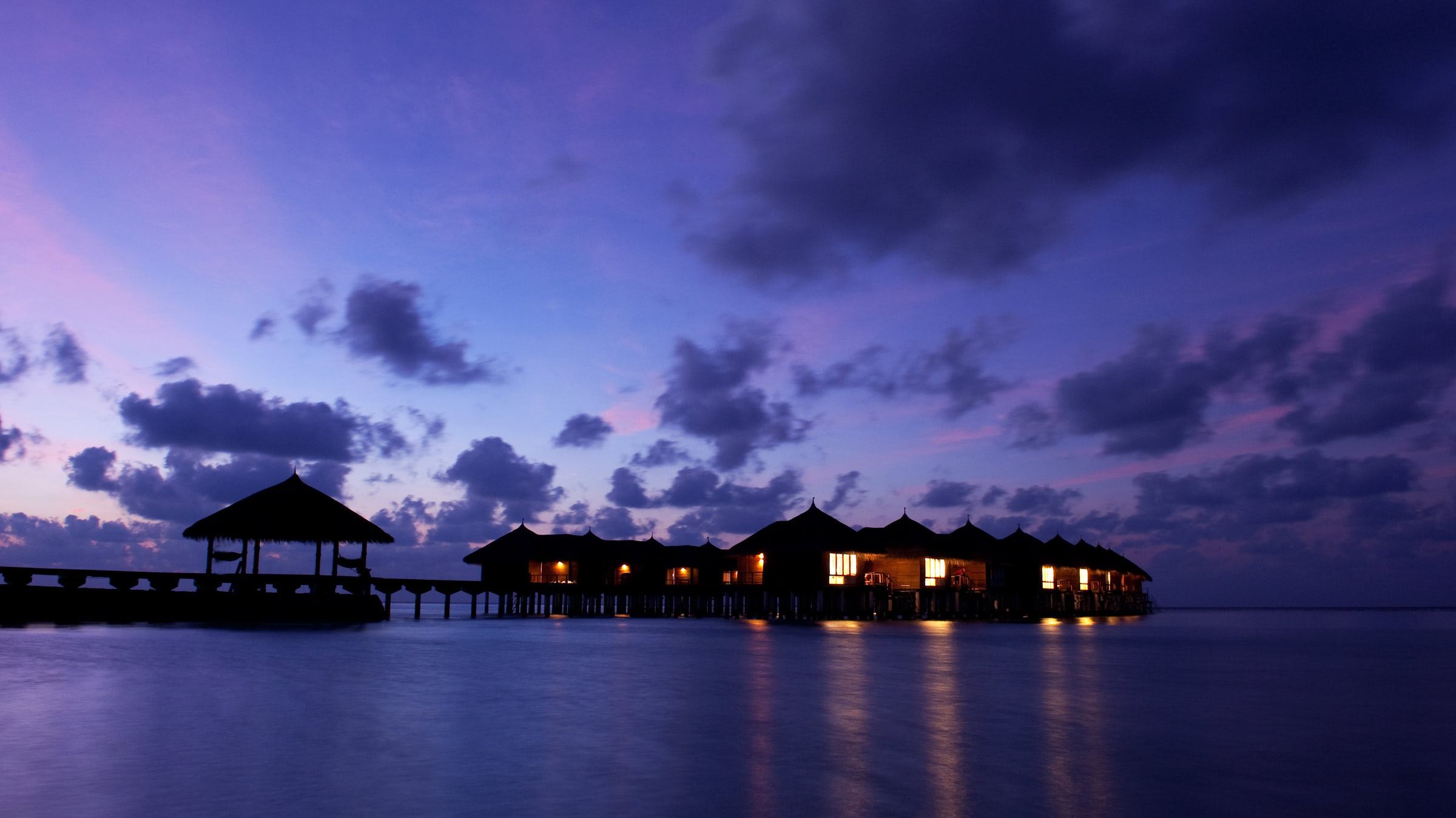 This beautiful wallpaper shows small, beautifully lit cottages on Maafushivaru island, with thatched roofs standing tall and together in the middle of the sea. This seems like the perfect place to vacation with your loved one, spend some quality time enjoying the views, relax, unwind and add a little romance in your life. You can sit for hours and admire the calm waters surrounding the Maafushivaru resort cottages. The sky looks just as beautiful, with floating clouds. This wallpaper makes you wonder how relaxing it would be to sit in the cottage surrounded by water and enjoy the natural beauty of this spectacular location.