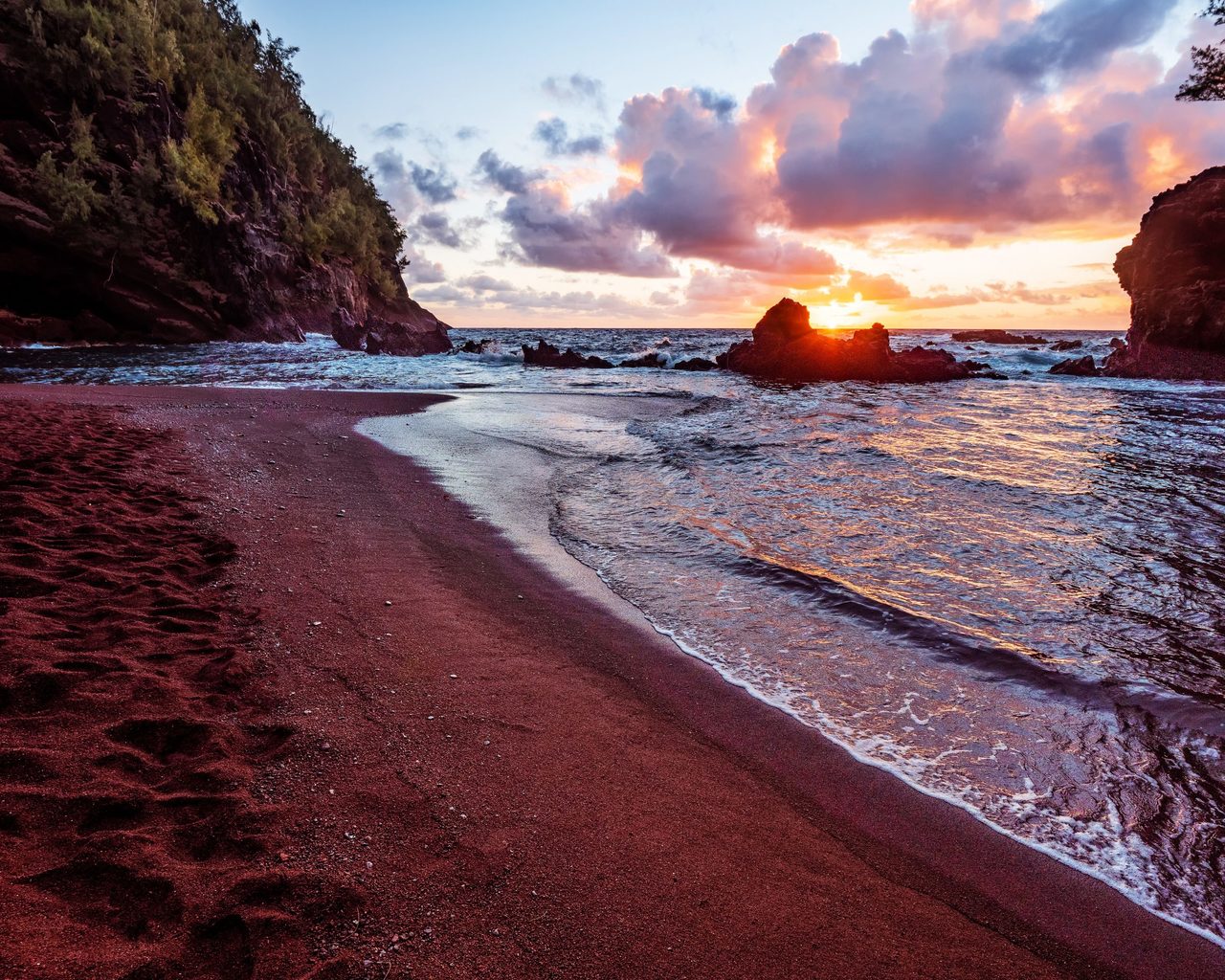 This gorgeous picture of Hana shows one of the beautiful beaches this place has. Enjoy this beautiful sandy beach and skies colored by a stunning sunset in Hana, Hawaii.