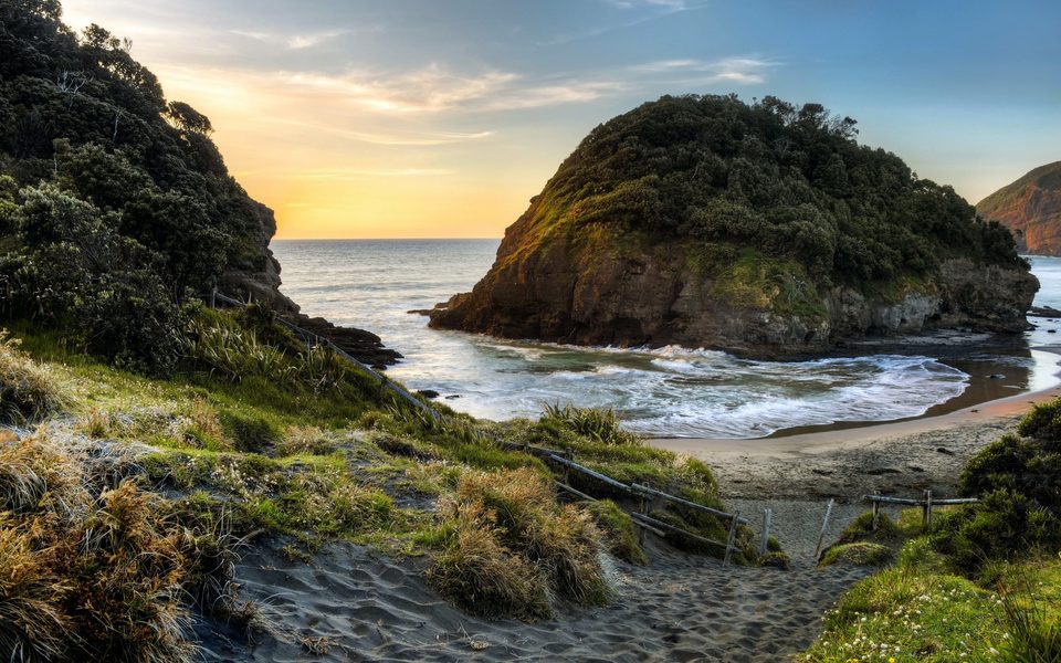 Te Henga beach is smaller than the other beaches, with a cozier feel. The sand starts well back from the surf and there is a simple lagoon before the river approaches the sea. A walking track crosses the northern headland to secluded O’Neill Bay, another favorite with surfers.