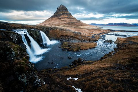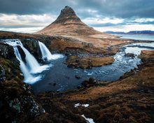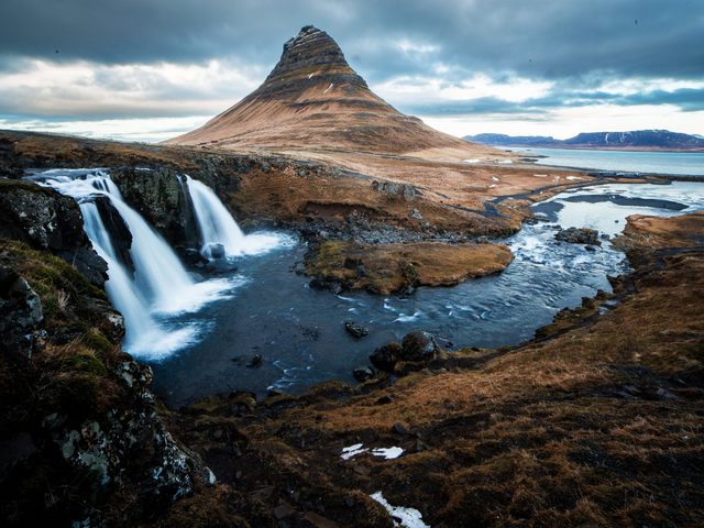 Mt. Kirkjufell is the most famous mountain in Grundarfjörður and a landmark of the fishing town. Mt. Kirkjufell and Kirkjufellsfoss waterfall have become the most popular place for a photoshoot in Grundarfjörður. You’ll see crowds of visitors with cameras taking photos like this wallpaper with the waterfall in front. The old path was located on top of the waterfall, where you can see the old bridge. This waterfall in the front and the distinctive mountain in the background makes for a beautiful photo – and now everybody wants a background like this one.